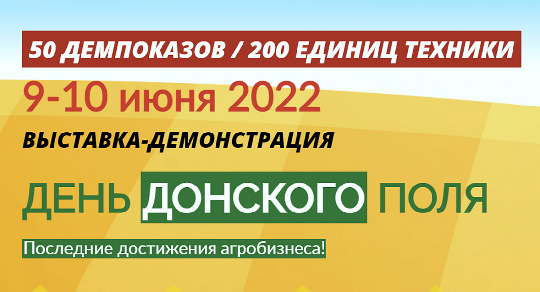 Выставка-демонстрация «День Донского поля» пройдет 9-10 июня в Зерноградском районе Ростовской области. В этом году специалисты в области растениеводства готовят программу работ на опытных полях, чтобы продемонстрировать свои достижения и инновации. Запланировано 16 опытных участков, в том числе по применению различных доз минеральных удобрений, фунгицидных препаратов, биостимуляторов и регуляторов роста на озимой пшенице и яровом ячмене. В рамках статичной экспозиции будет представлено более 200 единиц сельхозтехники ведущих брендов. Выставка-демонстрация «День Донского поля» подразумевает не только наличие статичной экспозиции техники, но и площадки в 10 Га для демонстрационных показов машин в работе, что поможет сравнить потенциал техники для сельскохозяйственных работ от разных производителей в действии, оценить результат и задать вопросы конструкторам. Деловая программа «Дня Донского поля» включит четыре раздела: растениеводство, сельскохозяйственная техника, экономика и инфраструктура АПК, животноводство.
