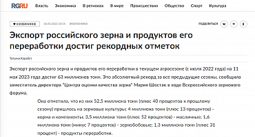 Экспорт российского зерна и продуктов его переработки достиг рекордных отметок